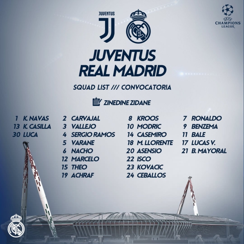 وضم خط الهجوم في قائمة ريال مدريد ضد يوفنتوس في بطولة دوري أبطال أوروبا كلاً من؛ كريستيانو رونالدو، كريم بنزيمة، غاريث بيل، لوكاس فاسكيز، وبورخا مايورال.