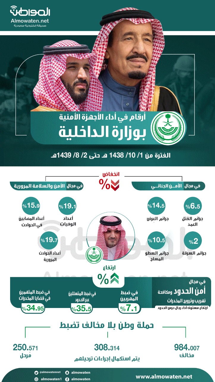 سلطت صحيفة “المواطن“، بالإنفوجرافيك الضوء على جهود وزارة الداخلية في ضبط الأمن وإحلال النظام بمختلف المناطق، خلال الفترة من 1 / 10 / 1438هـ حتى 2 / 8 / 1439هـ.