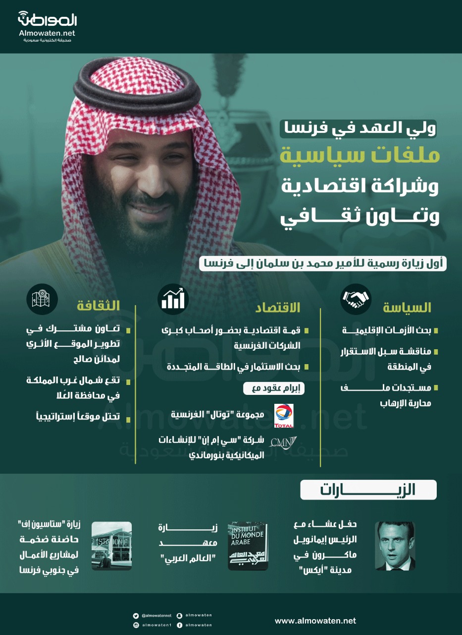 سلطت “المواطن“، بالإنفوجرافيك الضوء على الزيارة المهمة والتاريخية لولي العهد الأمير محمد بن سلمان إلى فرنسا، حيث وصل ولي العهد أمس الأحد إلى باريس في أول زيارة رسمية له إلى فرنسا.