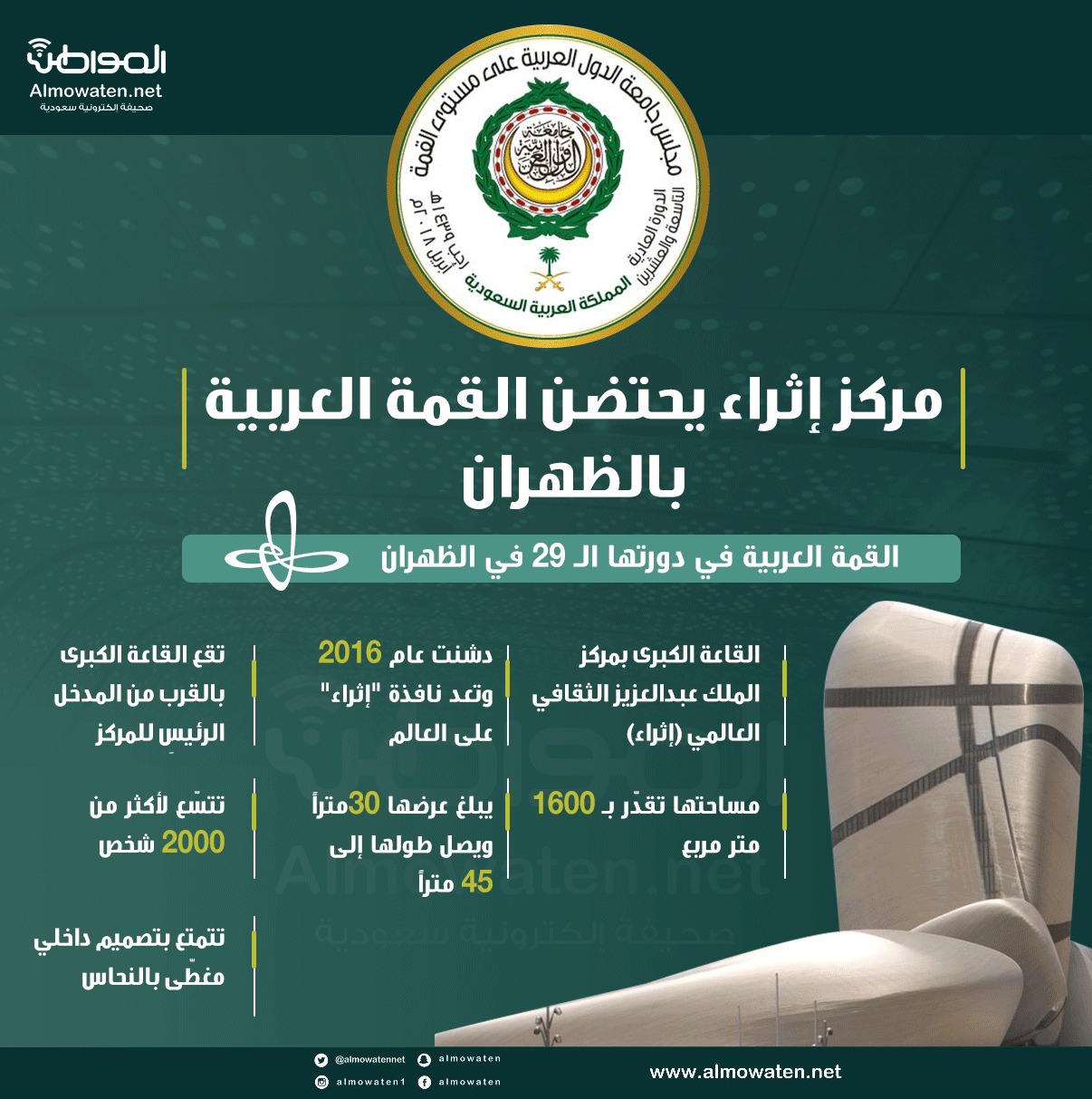 سلطت صحيفة “المواطن” بالإنفوجرافيك الضوءَ على مركز الملك عبدالعزيز الثقافي العالمي “إثراء” بالظهران، والذي من المقرر أن يستضيف وللمرة الأولى، أعمالَ القمة العربية “29”، التي يشارك فيها قادة الدول العربية من أعضاء جامعة الدول العربية الـ 22، وسط أجواء من التفاؤل لعديد من الدول العربية في العمل على صياغة مستقبل عربي أكثر قوة وفاعلية.
