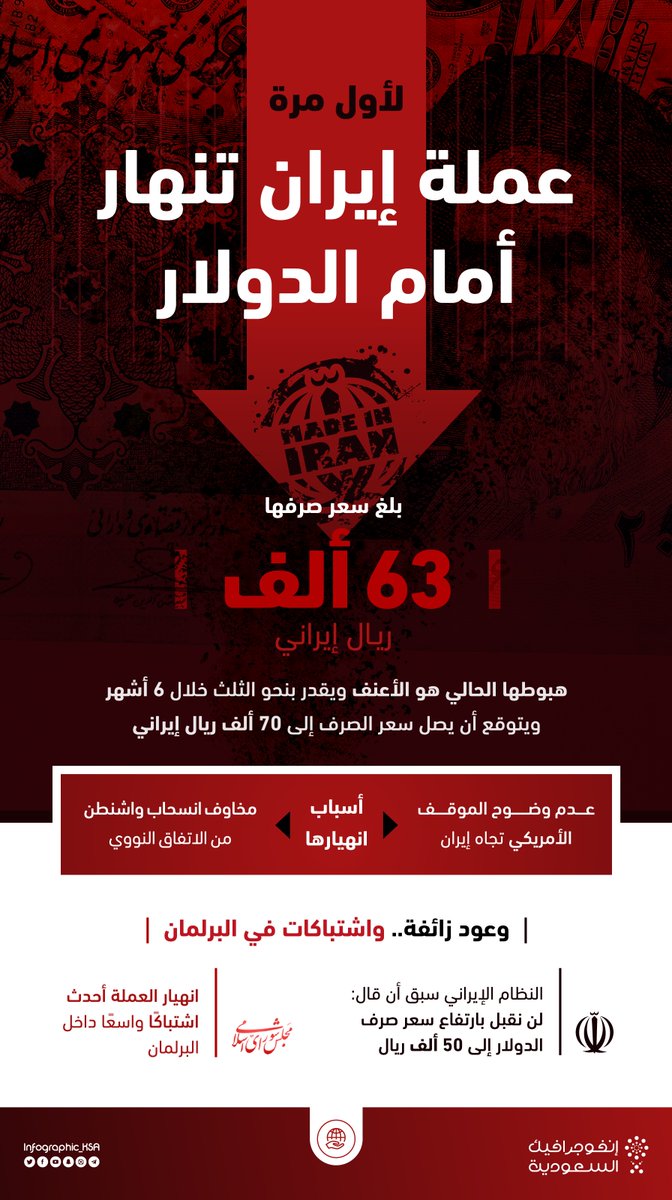 وبيّن إنفوجرافيك السعودية أن سعر صرف العملة الإيرانية أمام الدولار بلغ 63 ألف ريال إيراني، ليكون هبوطها هو الأعنف ويقدر بنحو الثلث هلال 6 أشهر، كما يتوقع أن يصل سعر الصرف إلى 70 ألف ريال إيراني.