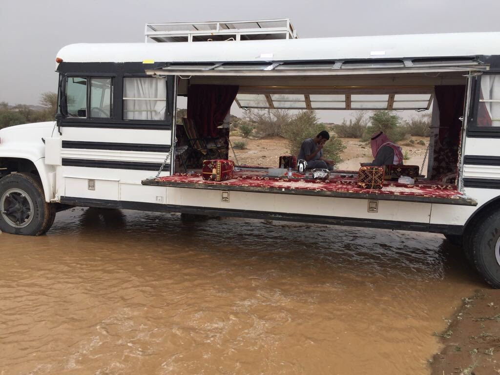 وبينت صور متداولة على موقع “تويتر” مواطنين سعوديين استغلوا حافلة قديمة بشكل مميز للمكوث فيها بعيدًا عن الأمطار، حيث جهزوا أماكن للجلوس والطعام عن طريق فتح جانبها، فيما ساعد ارتفاع الحافلة في ابتعادهم عن مياه الأمطار، وربما ما زاد من طمأنتهم أن ثقلها سيحميهم أيضًا من أي سيول ضعيفة قد تمر على المكان.