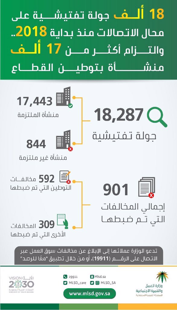 نفّذت وزارة العمل والتنمية الاجتماعية، بمشاركة عدد من الجهات الحكومية 18.287 جولة تفتيشية على المجمعات والمحال التجارية في مختلف مناطق المملكة، وذلك في إطار التحقق من التزام منشآت القطاع الخاص بقرار توطين قطاع الاتصالات.