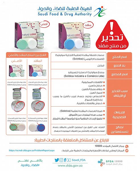 حذّرت الهيئة العامة للغذاء والدواء من استخدام عدسات لاصقة مقلدة للعلامة التجارية سولوتيكا (للاستخدام اليومي) (Solotica)، التي ينتجها مصنع سولوتيكا اندستريا كوميرشو (Sol?tica Ind?stria e Comércio Ltda) في البرازيل.