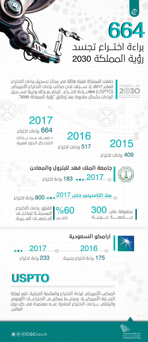 وجاءت الأرقام مذهلة بكل المقاييس في 2017، إذ بلغ عدد براءات الاختراع السعودية 664، وهو ضعف عدد البراءات التي حصلتها عليها الدول العربية مجتمعة. وكذلك واصلت تقدمها في هذا المجال، إذ سجلت 409 براءات في العام 2015، و517 براءة في 2016 – العام الذي أطلقت فيه “رؤية المملكة 2030”.