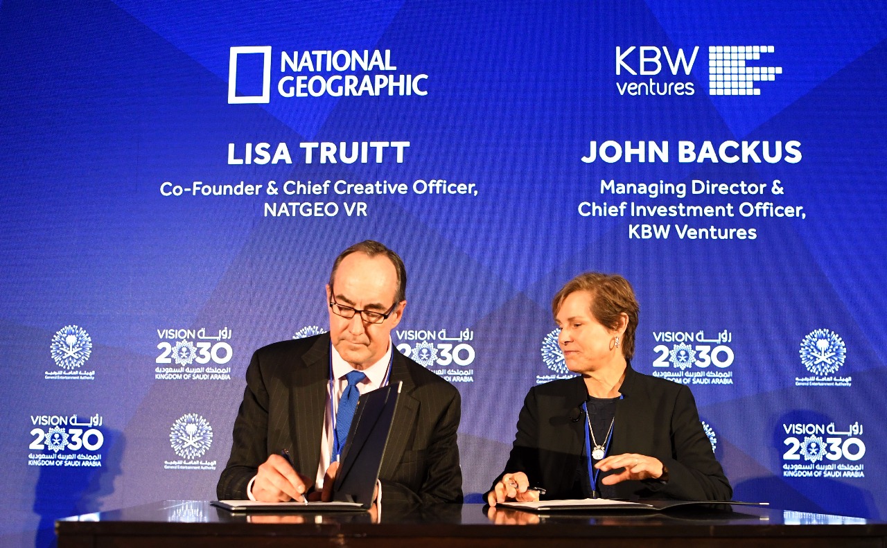 كما تم توقيع الاتفاقية الثالثة مع “ناشيونال جيوغرافيك” التي ستقوم من خلالها بالتعاون الهيئة العامة للترفيه و (KBW Ventures) ببناء مدن مختلفة بتقنية VR في مناطق المملكة، حيث سيبدأ العمل في أول موقع بالرياض بداية العام القادم 2019م.