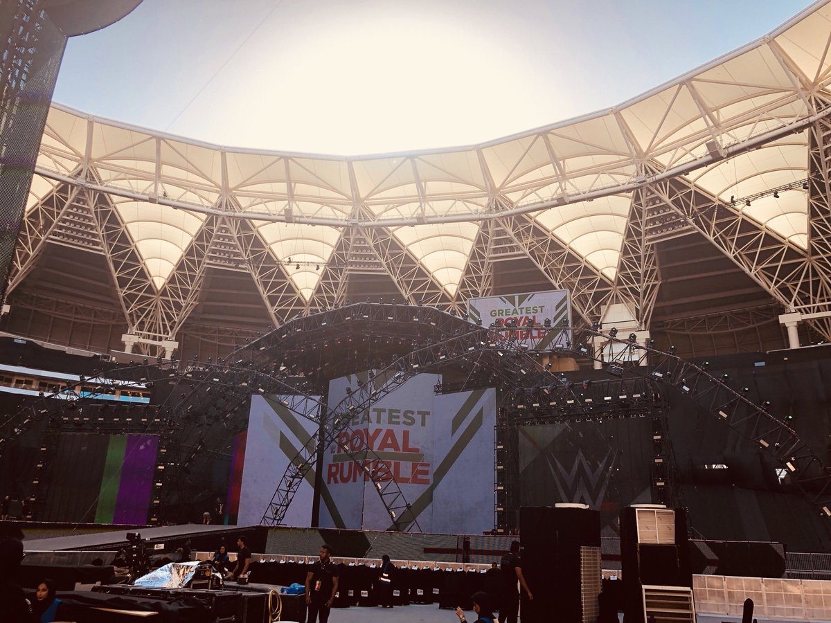 ونشر حساب الهيئة العامة للرياضة الرسمي على “تويتر”، صورًا وعلق عليها قائلًا: “حلبة WWE في إستاد الجوهرة بجدة في أتم الجاهزية لاستضافة الحدث العالمي الكبير اليوم.. أعظم رويال رامبل”.