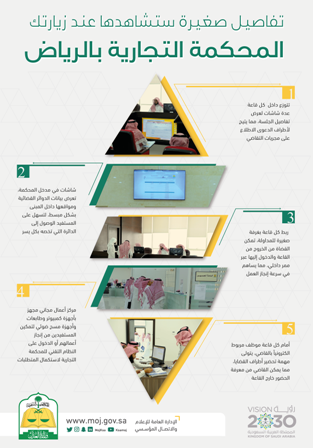ومثلما تصافح الخدمات الإلكترونية زوّار موقع بوابة وزارة العدل على شبكة الإنترنت؛ يبدأ المراجع للمحكمة التجارية في الرياض مصافحة التقنية عبر الشاشات التي وضعت في مدخل المحكمة، والتي تعرض، عبر بيانات مجدولة، تفاصيل الدوائر القضائية، ومواقع كل دائرة في المبنى، مما يسهل على المستفيدين معرفة موقع الدائرة المطلوبة دون الحاجة إلى السؤال.