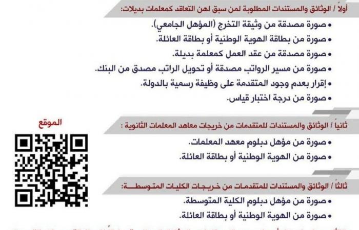 دعت وزارة التعليم، ممثلة في الإدارة العامة للتعليم بمنطقة الرياض، اليوم الثلاثاء، المعلمات البديلات وخريجات معاهد المعلمات والكليات المتوسطة لحصرهن، وذلك تنفيذاً لقرار مجلس الوزراء بتطبيق ضوابط التثبيت عليهن.