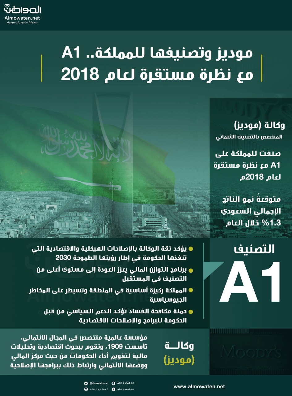رصدت صحيفة “المواطن“، بالإنفوجرافيك، دلالات تصنيف وكالة (موديز) المتخصصة بالتصنيف الائتماني في تقريرها الذي صدر بالأمس عن المملكة عند A1 مع نظرة مستقرة للعام الجاري 2018م، متوقعةً نمو الناتج الإجمالي السعودي 1.3% في 2018م.