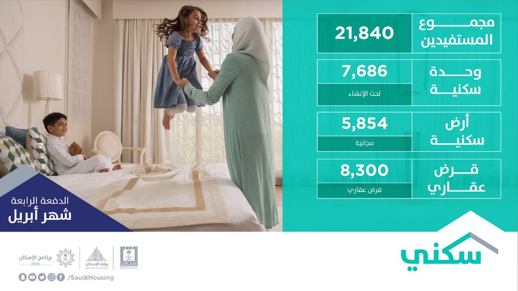 أعلنت وزارة الإسكان وصندوق التنمية العقارية، منذ قليل، تفاصيل الدفعة الرابعة من برنامج “سكني” لعام 2018م، وبإجمالي يصل إلى 21840 منتجاً سكنياً وتمويلياً، تتوزع على جميع مناطق المملكة، وذلك ضمن مستهدفات البرنامج خلال العام الجاري والبالغة 300 ألف منتج، ليصبح مجموع ما تم تخصيصه خلال الأشهر الأربعة الأولى 83562 منتجاً سكنياً وتمويلياً.