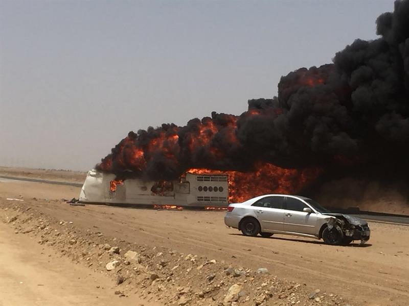 وأضافت أن التحقيقات الأولية كشفت أن الحادث وقع بعدما حاول سائق السيارة الصغيرة وهو سوداني الجنسية تجاوز الناقلة ليصطدم بمقدمة الحافلة القادمة بالاتجاه المعاكس من الطريق؛ ما تسبب في انحرافها واصطدامها بالناقلة البترولية واشتعالها.