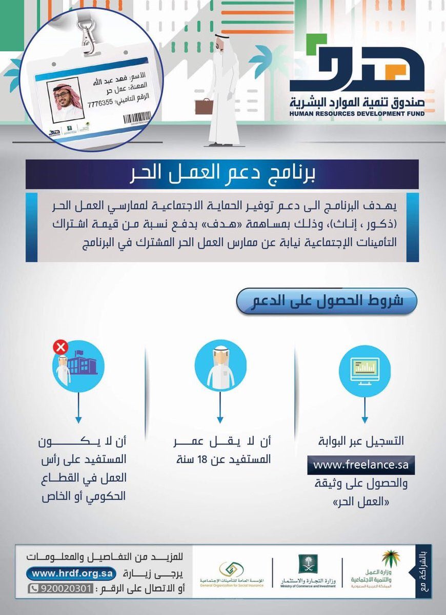 وبيَّن المتحدث الرسمي لوزارة العمل والتنمية الاجتماعية وصندوق تنمية الموارد البشرية “هدف” خالد أبا الخيل ، أن “هدف” يسهم في دفع نسبة من قيمة اشتراك المؤسسة العامة للتأمينات الاجتماعية نيابة عن ممارس العمل الحر المشترك في البرنامج, بهدف توفير الحماية الاجتماعية لممارسي العمل الحر (ذكوراً، وإناثاً) في المملكة.