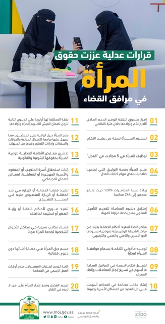 عززت وزارة العدل من حقوق المرأة، عبر 20 قراراً عدلياً خلال العام الأخير، شملت جميع نواحي التعاملات القضائية.