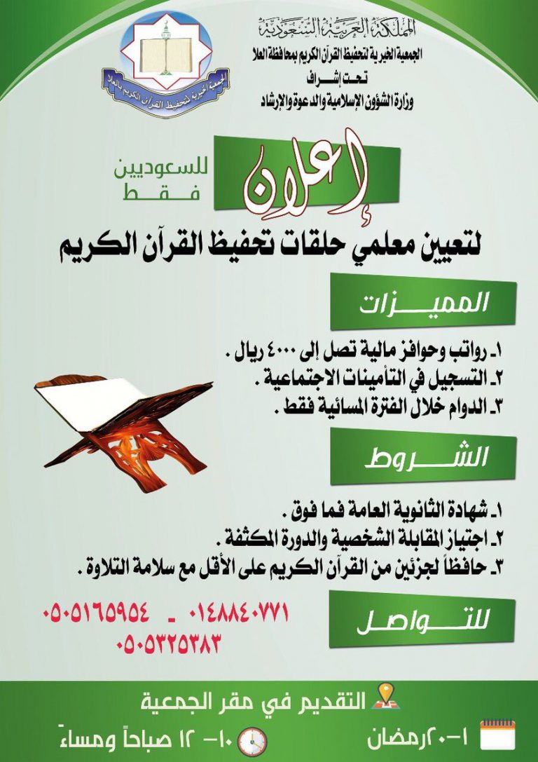 أعلنت جمعية تحفيظ القرآن الكريم بمحافظة العلا عن حاجتها لتعيين معلمي حلقات سعوديين فقط حسب التفاصيل التالية: