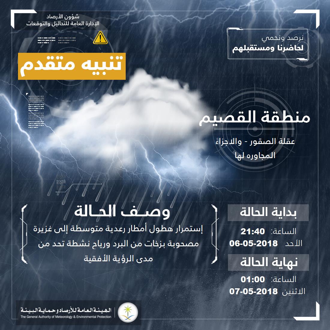 حذرت الهيئة العامة للأرصاد وحماية البيئة من حالة طقس غير مستقر على منطقة القصيم.