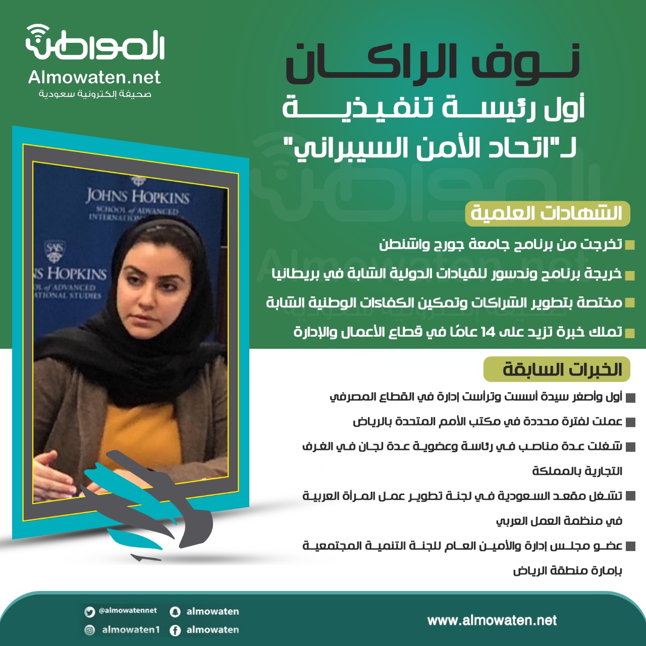 إنفوجرافيك “المواطن”.. نوف الراكان أول رئيسة تنفيذية لاتحاد الأمن السيبراني
