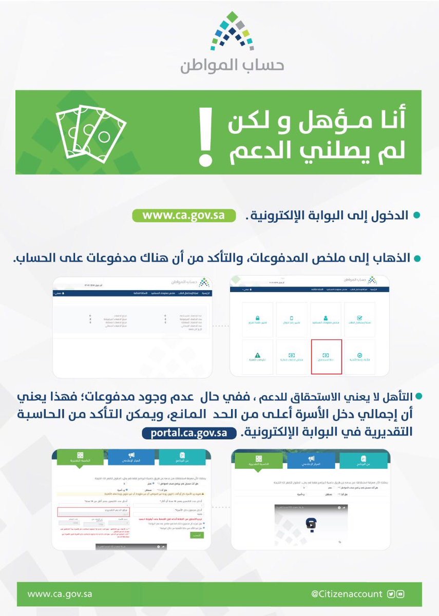 نشر حساب المواطن إنفوجرافيك يوضح موقف المستفيد في حال كان مؤهلًا، ولم يصله دعم برنامج حساب المواطن.