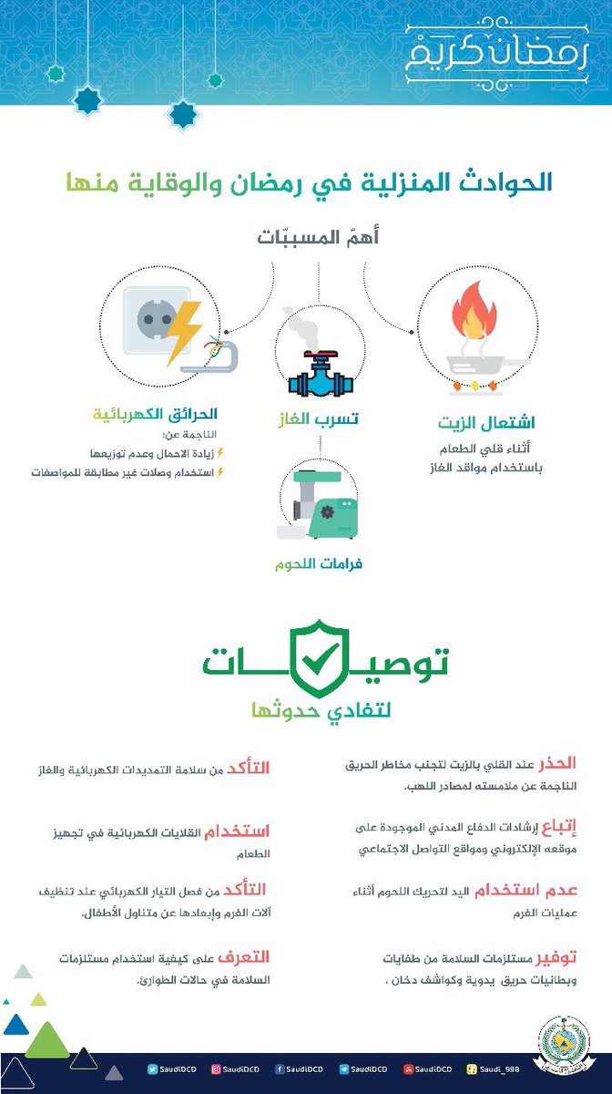 وبيّن الدفاع المدني عبر إنفوجرافيك نشره بحسابه الرسمي على “تويتر” أن اشتعال الزيت أثناء قلي الطعام باستخدام مواقد الغاز، وأيضًا تسرب الغاز، بالإضافة إلى الحرائق الكهربائية الناجمة عن زيادة الأحمال وعدم توزيعها واستخدام وصلات غير مطابقة للمواصفات.