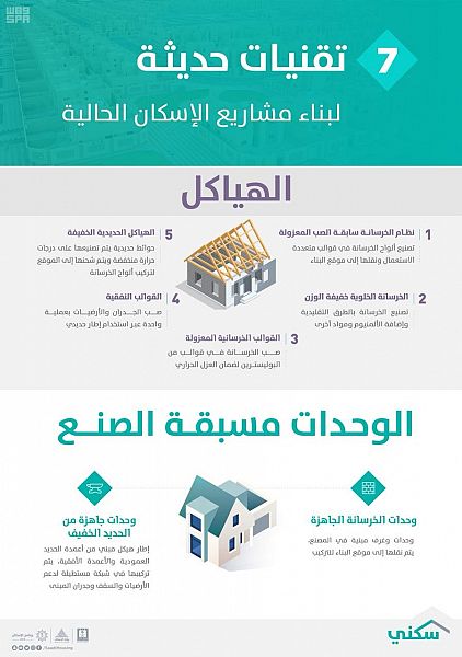 بدأت وزارة الإسكان تفعيل 7 تقنيات بناء حديثة، لتنفيذ مشاريعها الحالية التي تتم بالشراكة مع القطاع الخاص، فيما تتواصل الجهود لجلب المزيد من التقنيات الأخرى للمشاريع المستقبلية التي تعتزم الوزارة تنفيذها خلال الفترة المقبلة، وسبق أن أعلنت عنها ضمن برنامج “سكني”.