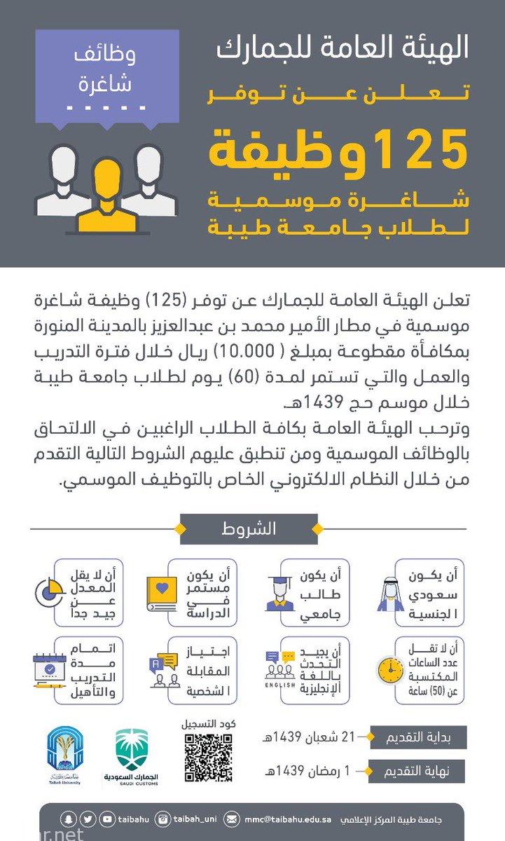 أعلنت الهيئة العامة للجمارك عن توفر (125) وظيفة شاغرة موسمية في مطار الأمير محمد بن عبدالعزيز بالمدينة المنورة @KsaCustoms ، بمكافأة مقطوعة بمبلغ ( 10000 ) ريال خلال فترة التدريب والعمل والتي تستمر لمدة ( 60 ) يوماً لطلاب جامعة طيبة خلال موسم حج 1439 ه.