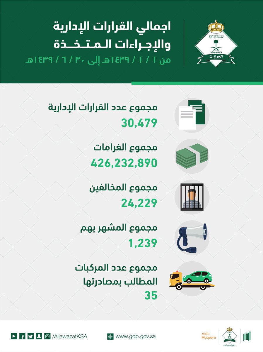 وأوضحت الجوازات أن مجموع عدد القرارات الإدارية 30.479 قرارًا، ومجموع الغرامات 426.232.890 غرامة، فيما بلغ مجموع المخالفين 24.229 مخالفًا، أما مجموع المشهر بهم فبلغ 1.239.