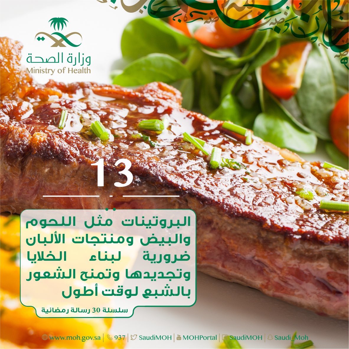وأوضحت الصحة في تغريدة لها عبر حسابها الرسمي بموقع “تويتر” أن البروتينات مثل اللحوم والبيض ومنتجات الألبان ضرورية لبناء الخلايا وتجديدها، لافتةً إلى أنها تمنح شعورًا بالشبع لوقت أطول.