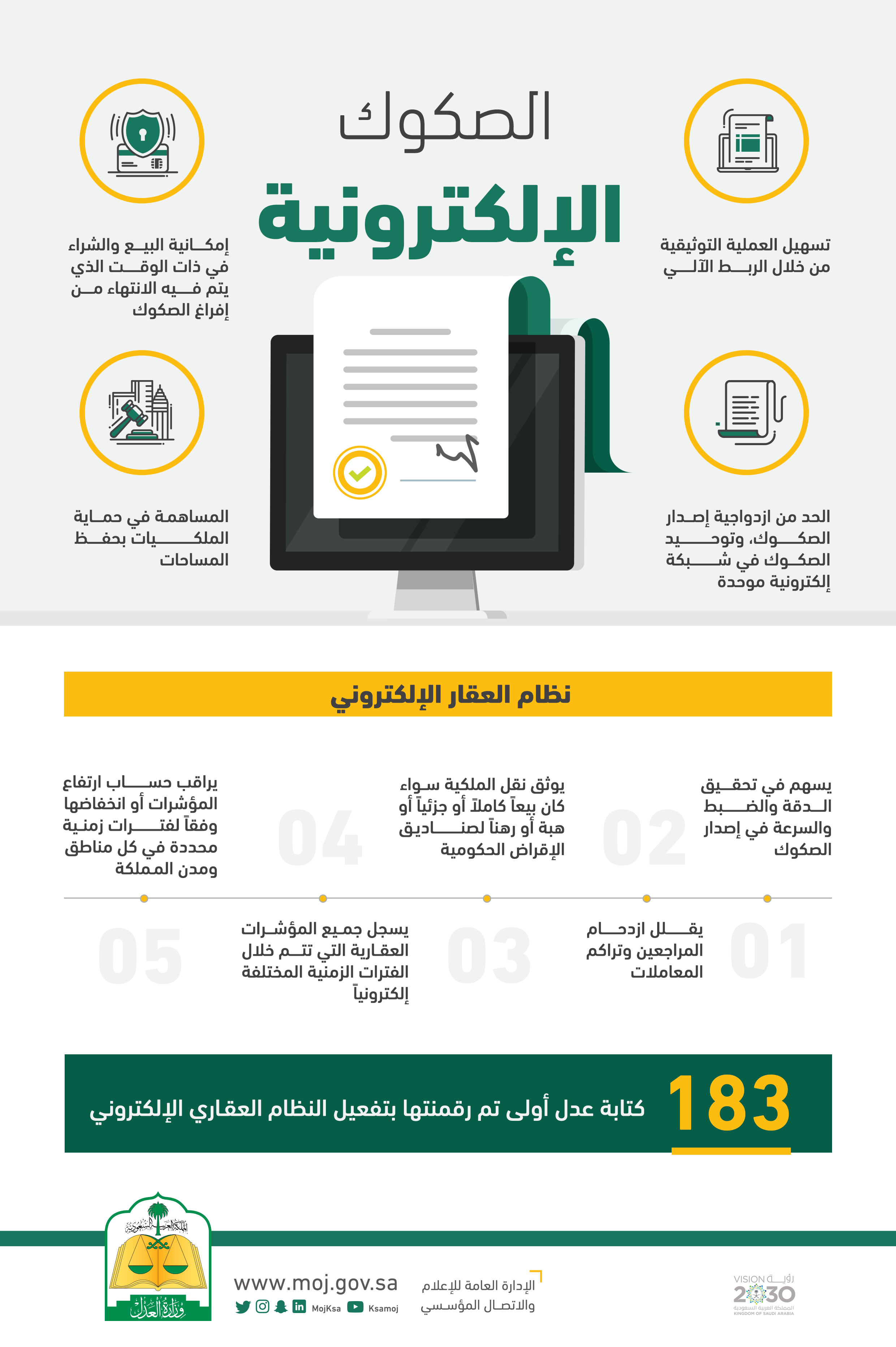 يذكر، أن كتابات العدل الأولى على مستوى المملكة أنجزت إصدار أكثر من مليوني صك إلكتروني شملت جميع العمليات العقارية خلال عام واحد فقط.
