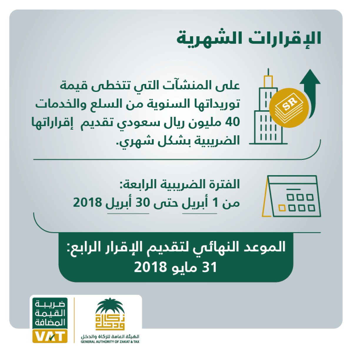 أكدت ضريبة القيمة المضافة أنه على المنشآت التي تزيد قيمة توريداتها السنوية عن 40 مليون ريال تقديم إقراراتها الضريبية الرابعة (شهر إبريل) قبل يوم 31 مايو 2018.