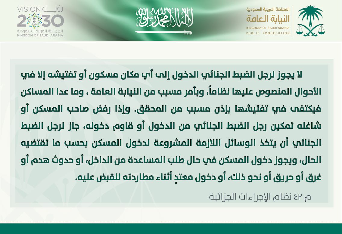 شددت النيابة العامة، على أنه لا يجوز دخول رجال الضبط الجنائي إلى أي مسكن أو تفتيشه إلا في الأحوال المنصوص عليها نظامًا.