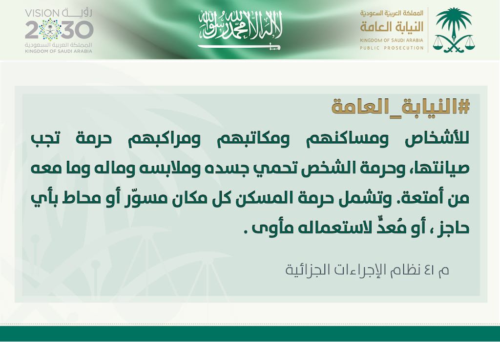 وأوضحت النيابة في تغريدة لها عبر حسابها الرسمي بموقع “تويتر” أن حرمة الشخص تشمل جسده وملابسه وماله وما معه من أمتعة أو أجهزة، فيما يقصد بالمسكن كل مكان مسوّر أو محاط بحاجز، أو مُعدٍّ كمأوى.