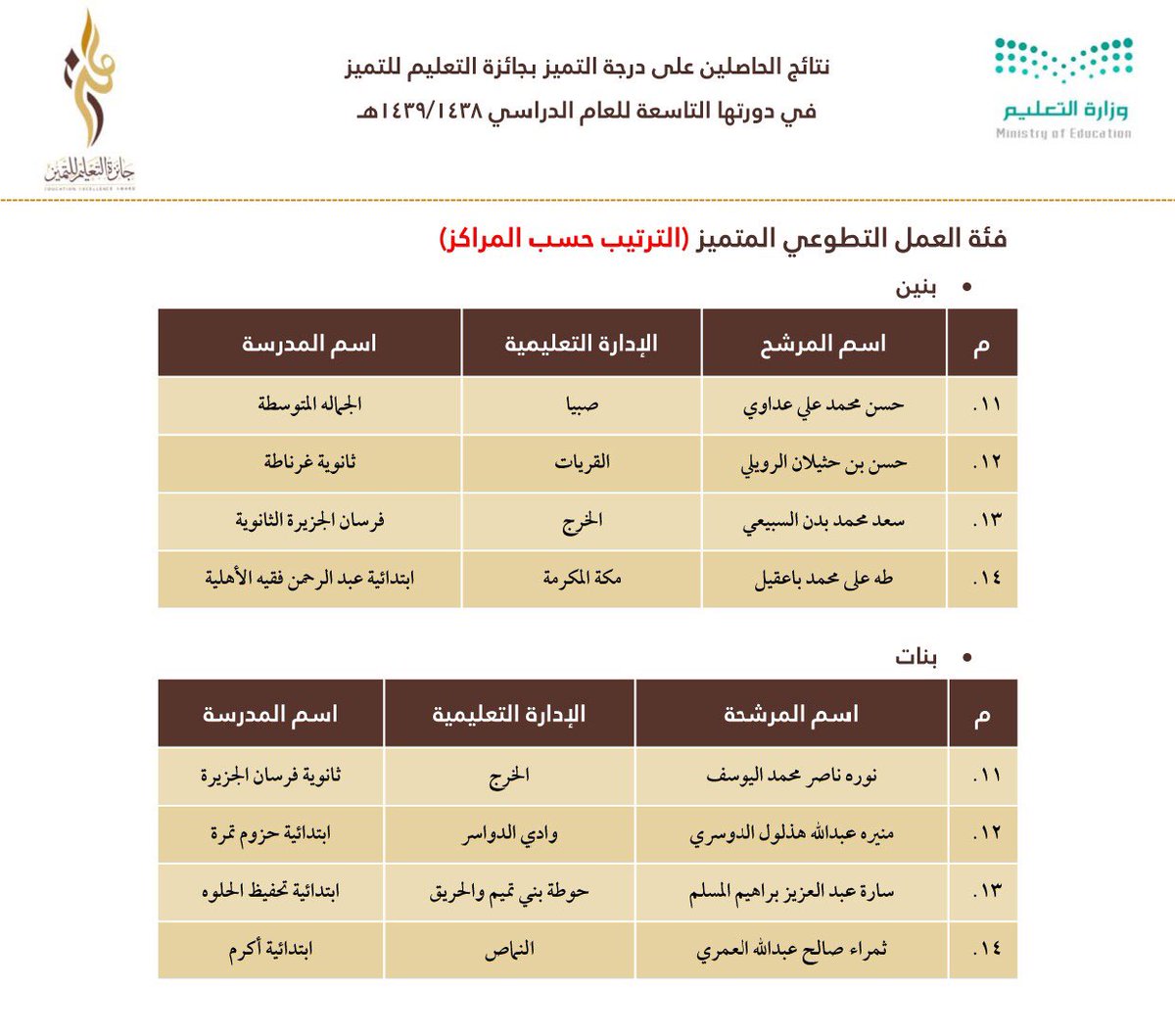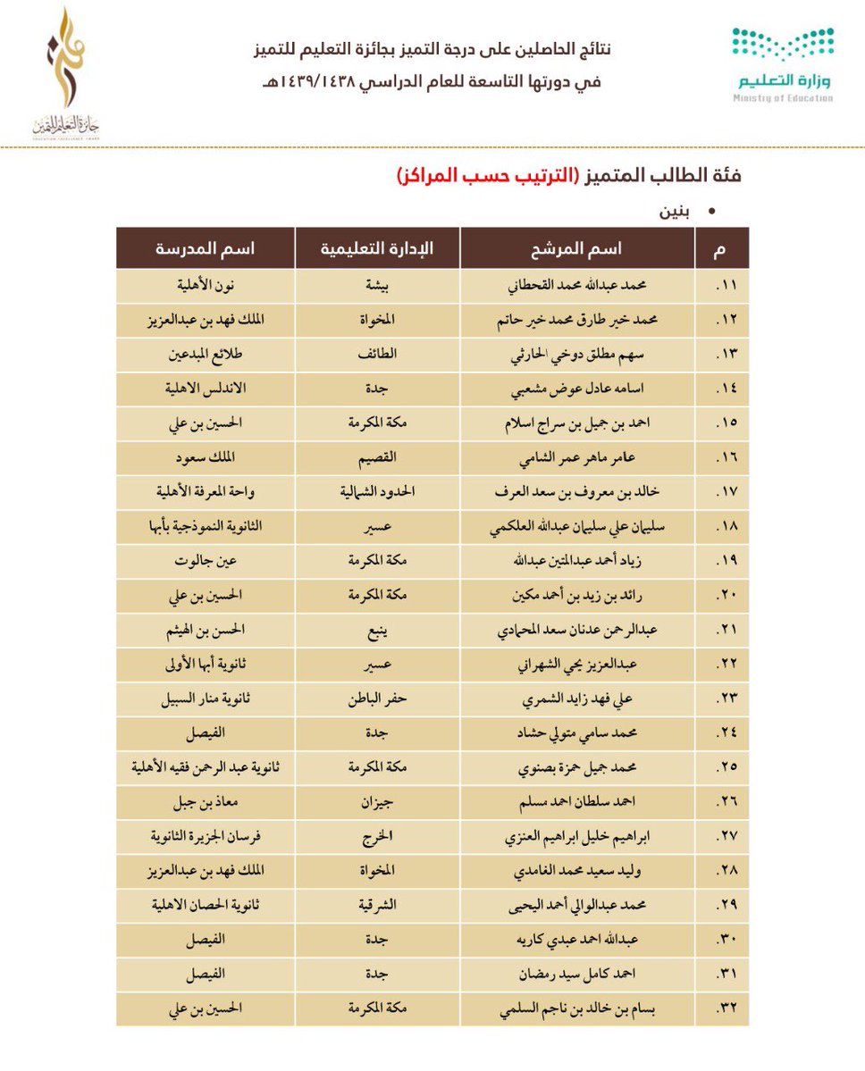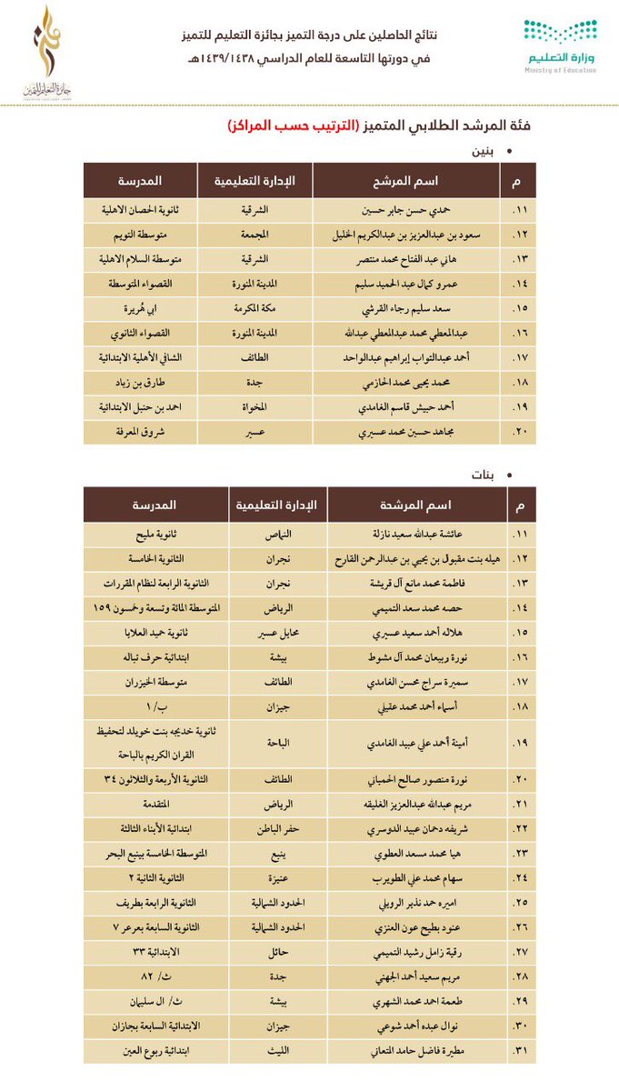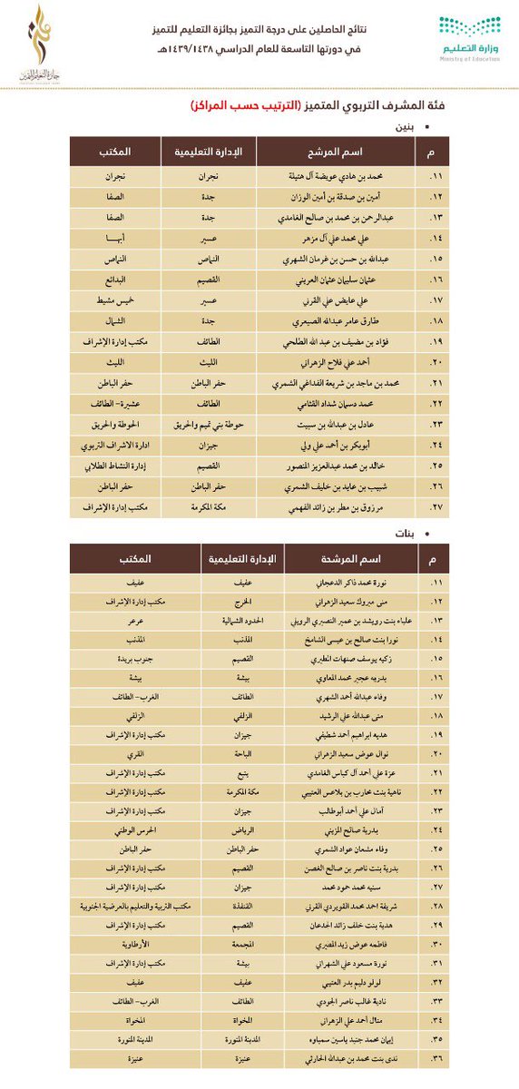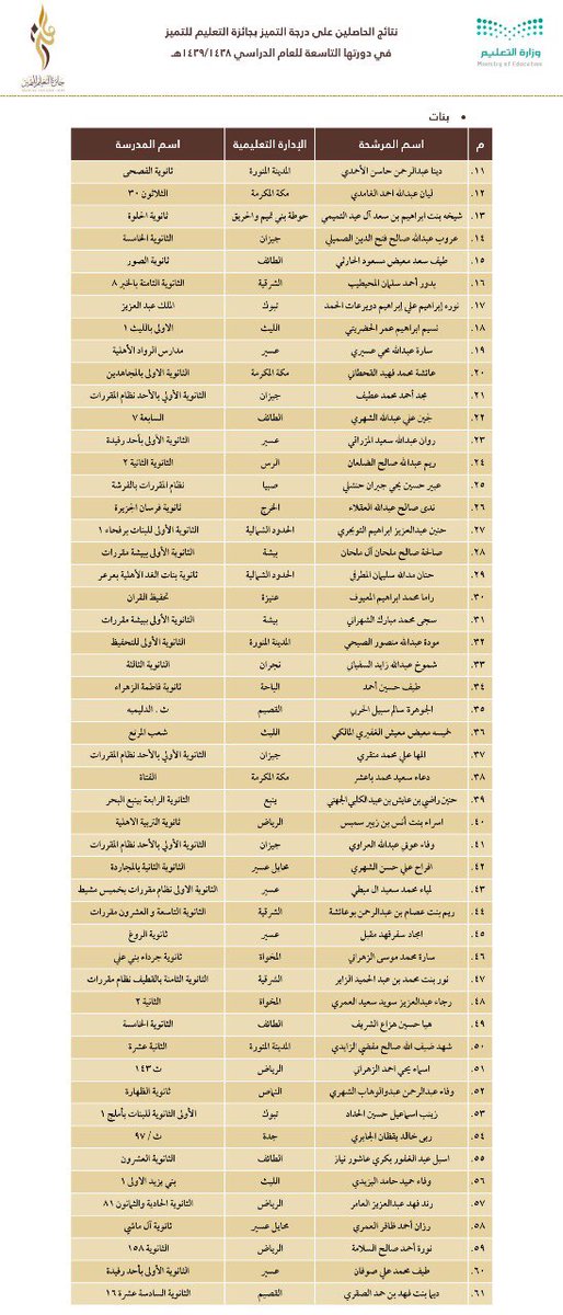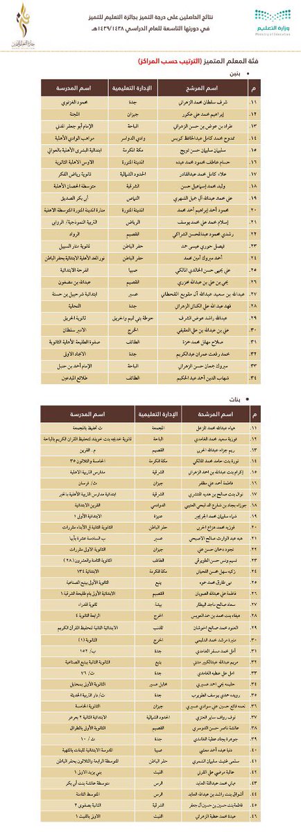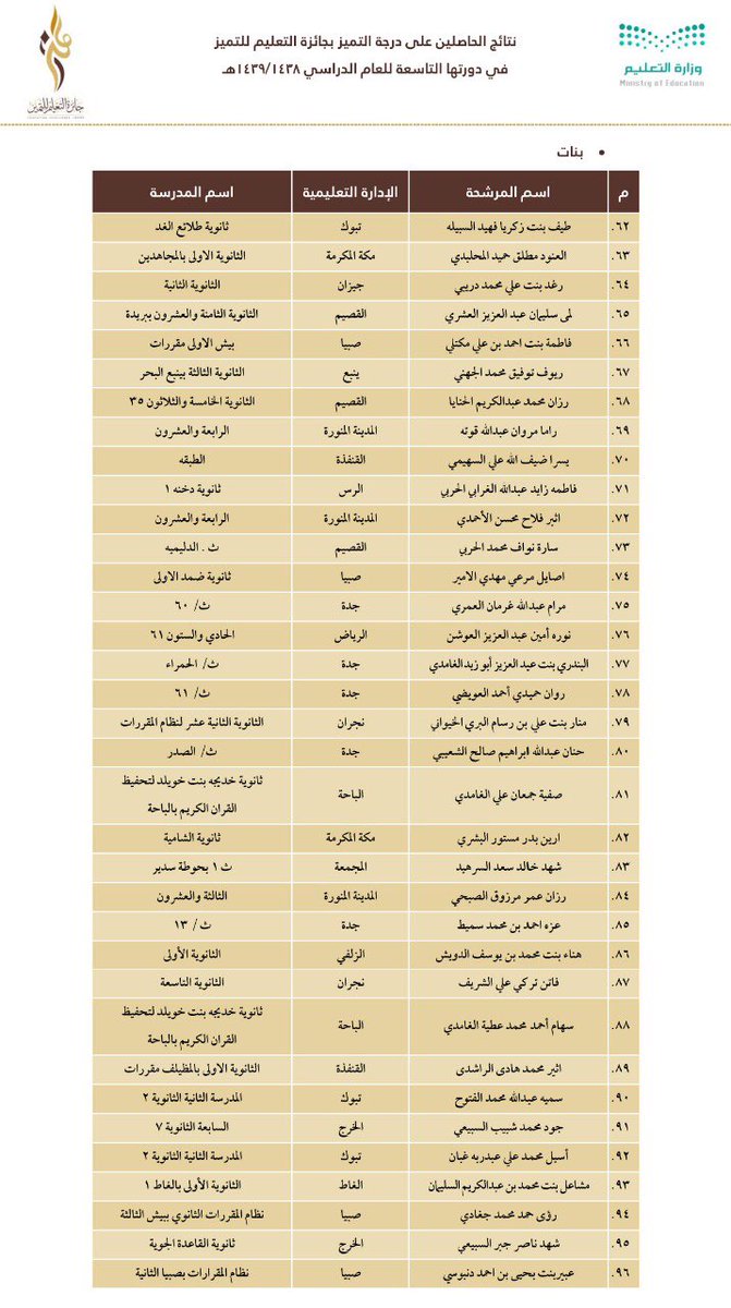 وجاءت أسماء الفائزين والفائزات على النحو التالي: