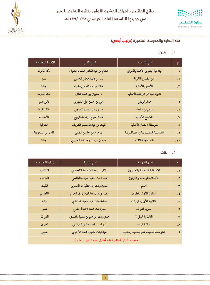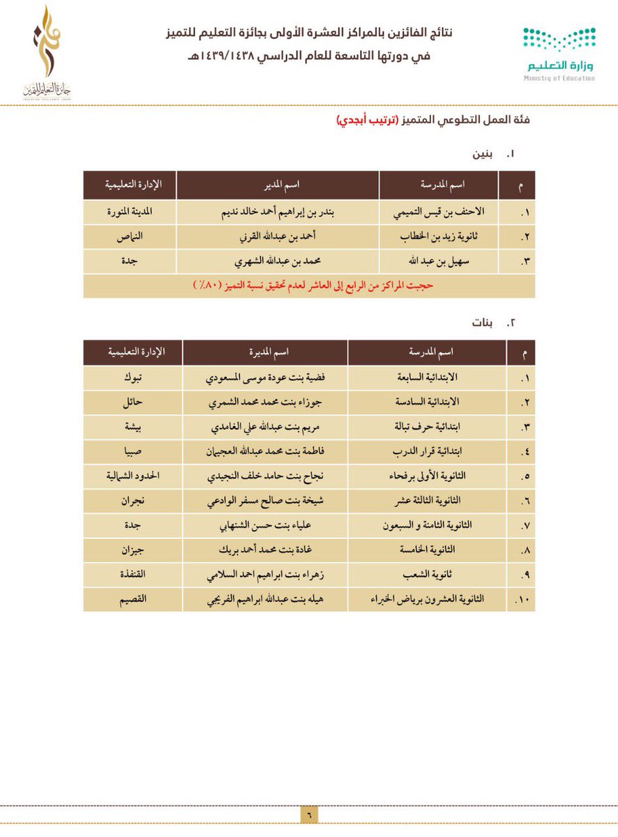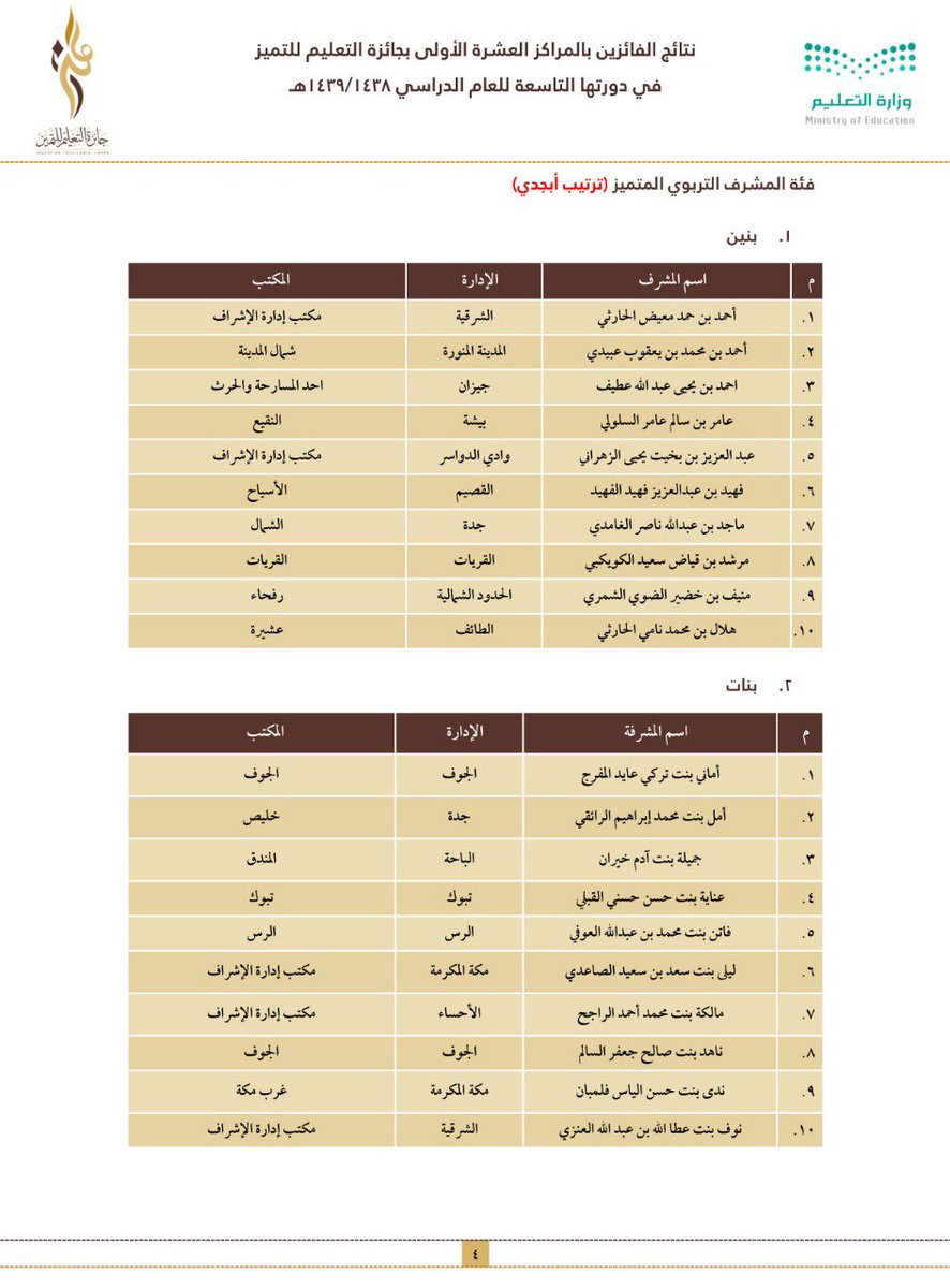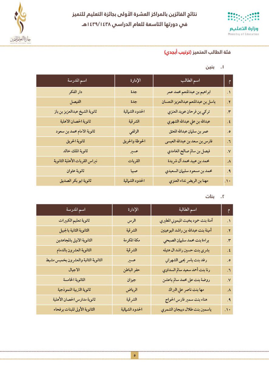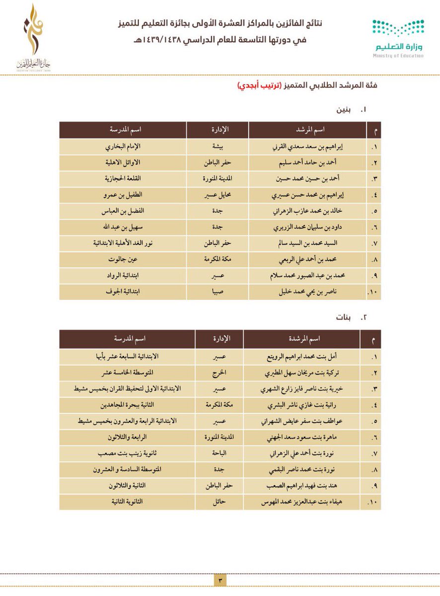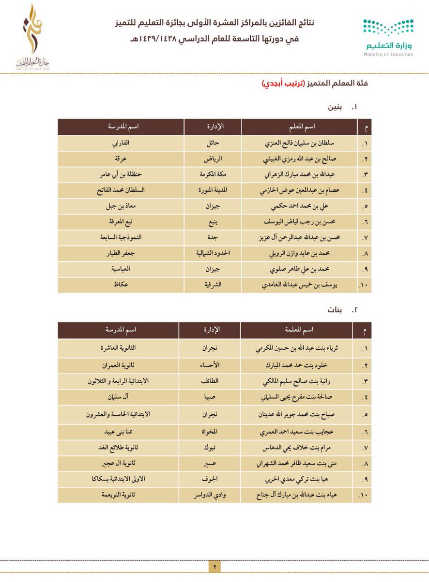 وجاءت أسماء الفائزين والفائزات على النحو التالي: