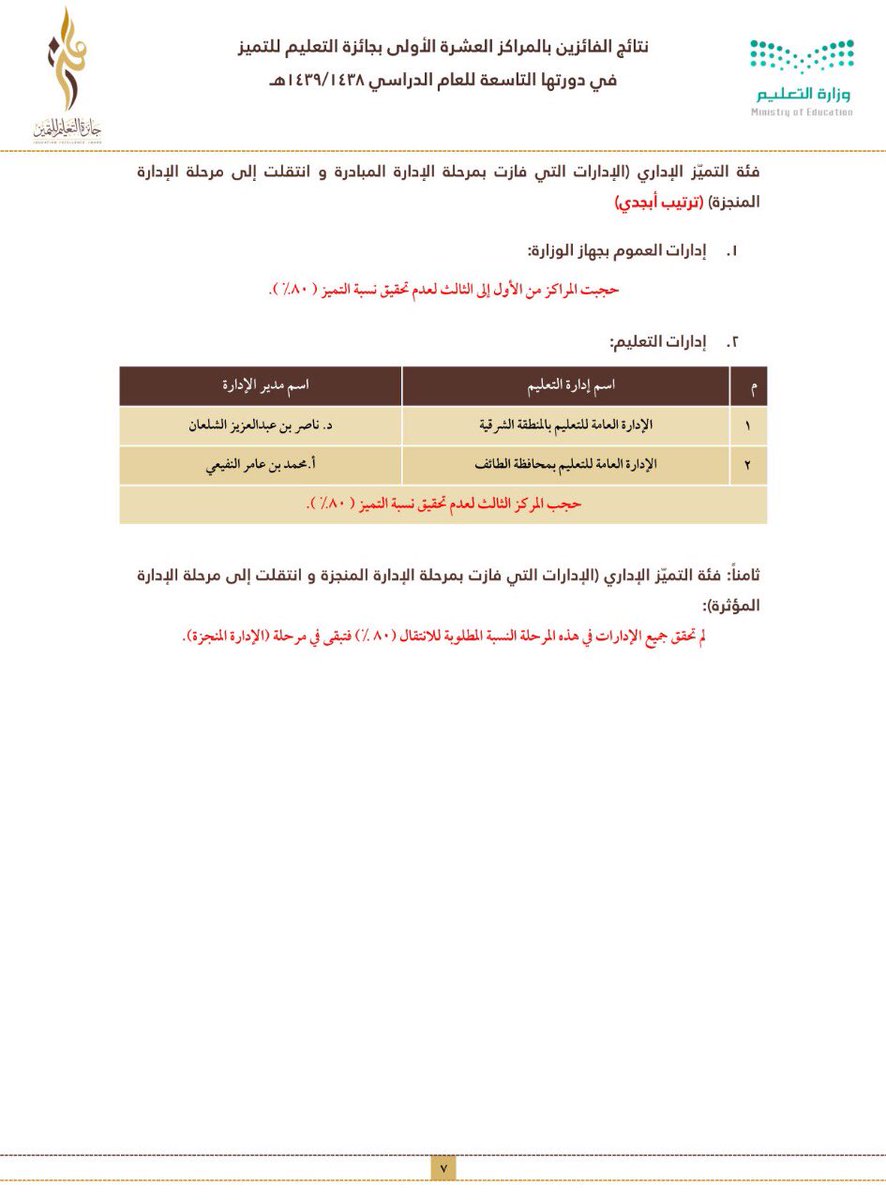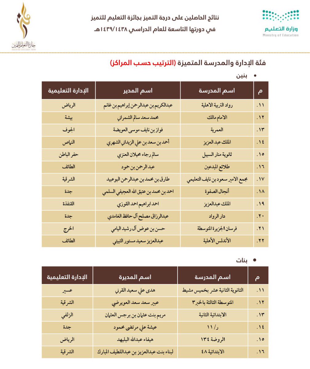 وقال الحساب الرسمي للجائزة على “تويتر”: نود إحاطة الجميع بأن التغذية الراجعة للتحكيم تم إدراجها في حسابات مراكز التميز في إدارات التعليم و كذلك حسابات إدارات العموم بالوزارة لجميع الملفات الفائزة وغير الفائزة، عدا الفائزين العشرة الأوائل لأغراض تنظيمية، مع تمنياتنا للجميع التوفيق والتميز المستمر.
