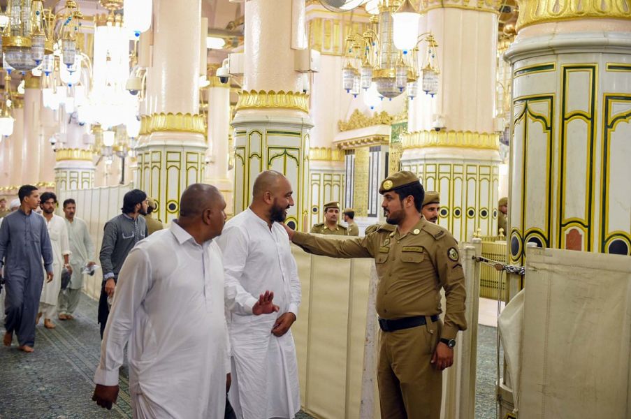 تواصل قوة أمن المسجد النبوي الشريف جهودها على مدار العام في تنظيم حشود الزائرين والمصلين داخل المسجد النبوي الشريف .