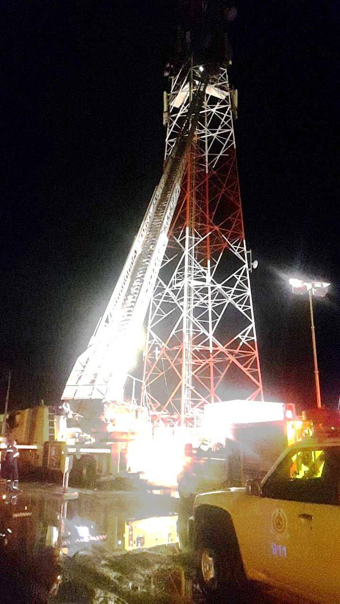 وأشار إلى أن المشاهدة الأولية عند وصول الفرق كانت تشير إلى وجود عامل عالق بأعلى البرج ، أدركت حينها الفِرَقُ من المشاهدة أن أي خطأ في عمليات الإنقاذ قد تودي بحياة العامل، وكانت تخشى الفرق أثناء أداء واجباتها الصعود من خلال سلالم البرج التي ينتج عنها اهتزاز للبرج مما يشكل خطورة بالغة على العامل، ولذلك تمت الاستعانة بسيارات السلالم للوصول إلى أقرب نقطة يمكن من خلالها التعامل بحذر بعد تأمين محيط العامل بوضع دعامات من السقالة الخشبية كعمل احترازي لحمايته من السقوط نتيجة أي خطأ وارد قد ينتج أثناء عمليات الإنقاذ، بينما كانت الوسادات الهوائية جاهزة لأي طارئ لا قدر الله.