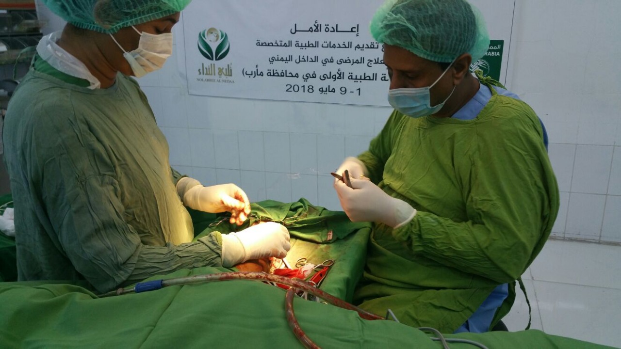 نجح الفريق الطبي الممول من مركز الملك سلمان للإغاثة والأعمال الإنسانية بالتعاون مع مبادرة نلبي النداء خلال يومي 2-3 /مايو الجاري في إجراء 27 عملية بالإضافة إلى الكشف على 50 حالة أخرى في مستشفيي هيئة مأرب وكرى.