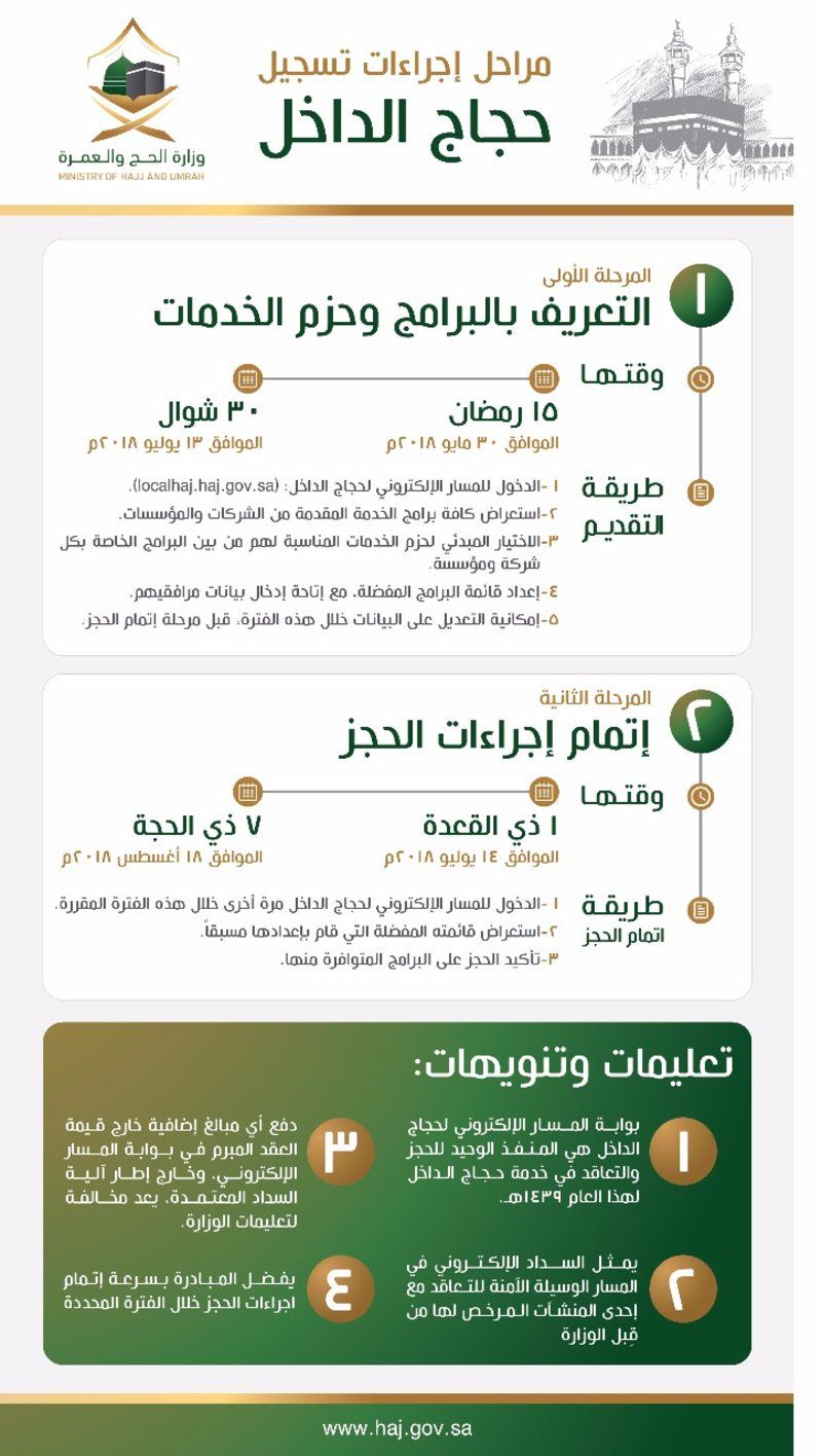 أطلقت وزارة الحج والعمرة إجراءات التسجيل في الشركات والمؤسسات المرخص لها بتقديم الخدمات لحجاج الداخل لموسم حج هذا العام، معلنة إتاحة الفرصة لاختيار الخدمة والسعر المناسب، للمواطنين والمقيمين الراغبين في أداء مناسك حج هذا العام (1439هـ).