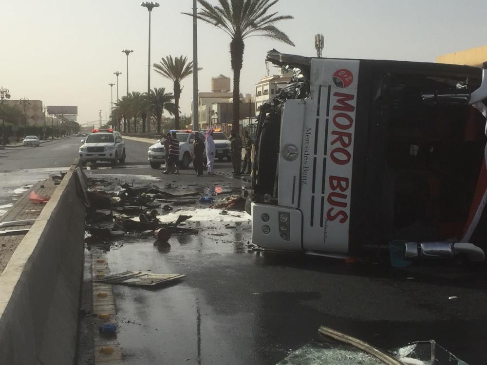 وأوضح المتحدث الرسمي لهيئة الهلال الأحمر السعودي بتبوك نبيل العنزي، أن غرفة العمليات تلقت بلاغاً من مواطن يفيد بوجود حادث تصادم وانقلاب باص نقل عمال، على طريق الملك عبدالعزيز مقابل مركز الحكير التجاري، مشيراً إلى أنه وعلى الفور اتجهت (4) فرق إسعافية للموقع وفرقة استجابة متقدمة وفرقة من مستشفى الملك سلمان العسكري، وبحضور مساعد المدير العام للشؤون الإسعافية بالمنطقة.