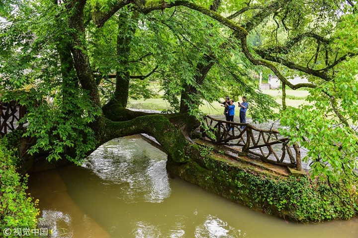 اتخذت شجرة كافور يبلغ عمرها 560 عامًا وضعًا غريبًا، بعد أن امتدت جذورها أعلى نهر بمنطقة يويوان في مقاطعة جيانشي شرق الصين، لتصنع ما يشبه الجسر الصغير بين ضفتيه.