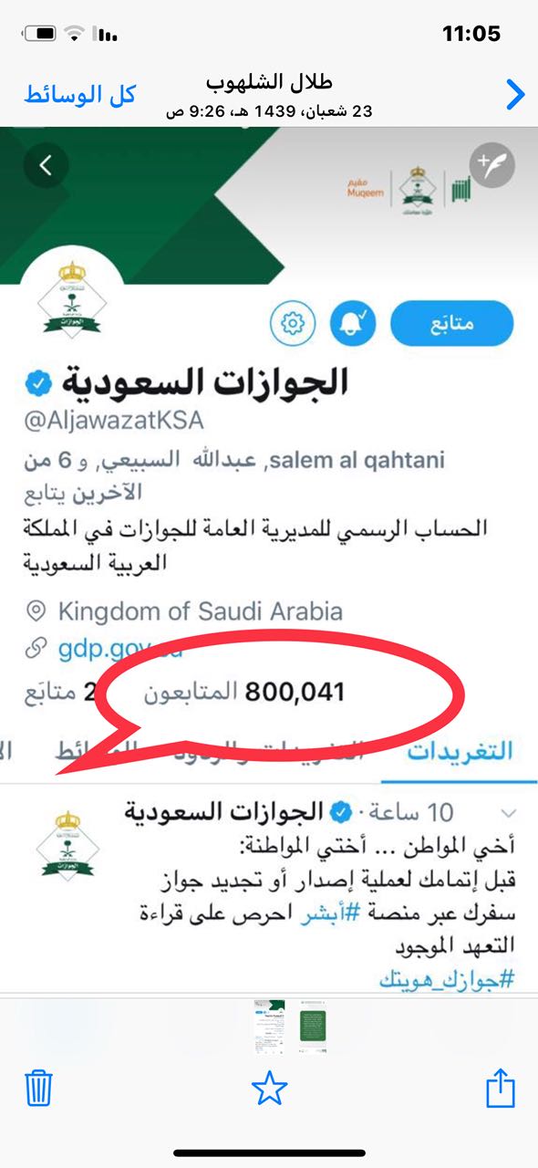 أعلنت المديرية العامة للجوازات أن عدد متابعيها عبر موقع التواصل الاجتماعي “تويتر”، تجاوز الـ 800 ألف متابع.