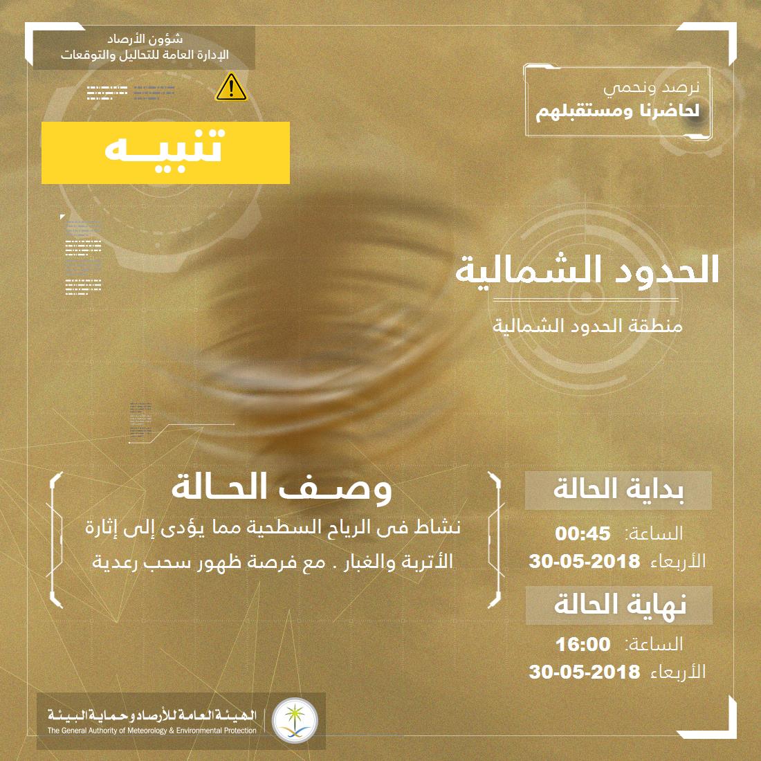 حذرت الهيئة العامة للأرصاد وحماية البيئة من طقس غير مستقر على منطقة الحدود الشمالية.