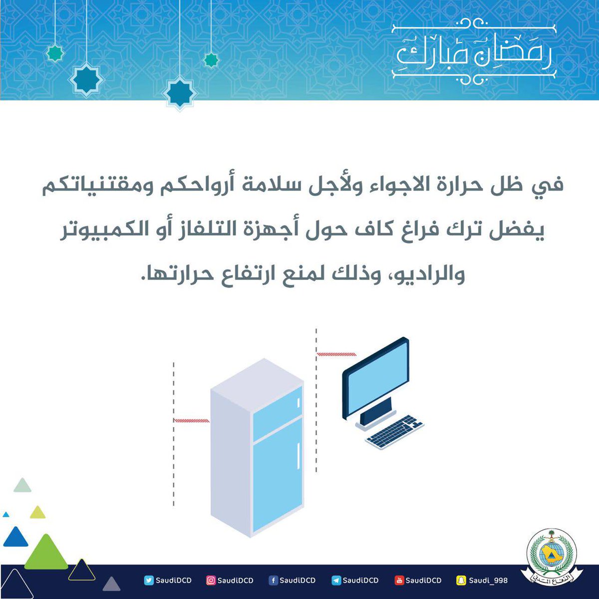وأوضح المدني، في تغريدة له عبر حسابه الرسمي بموقع “تويتر”، أنه في ظل حرارة الأجواء ولأجل سلامة الأرواح والمقتنيات يفضل ترك فراغ كافٍ حول أجهزة التلفاز أو الكمبيوتر والراديو؛ وذلك لمنع ارتفاع حرارتها.