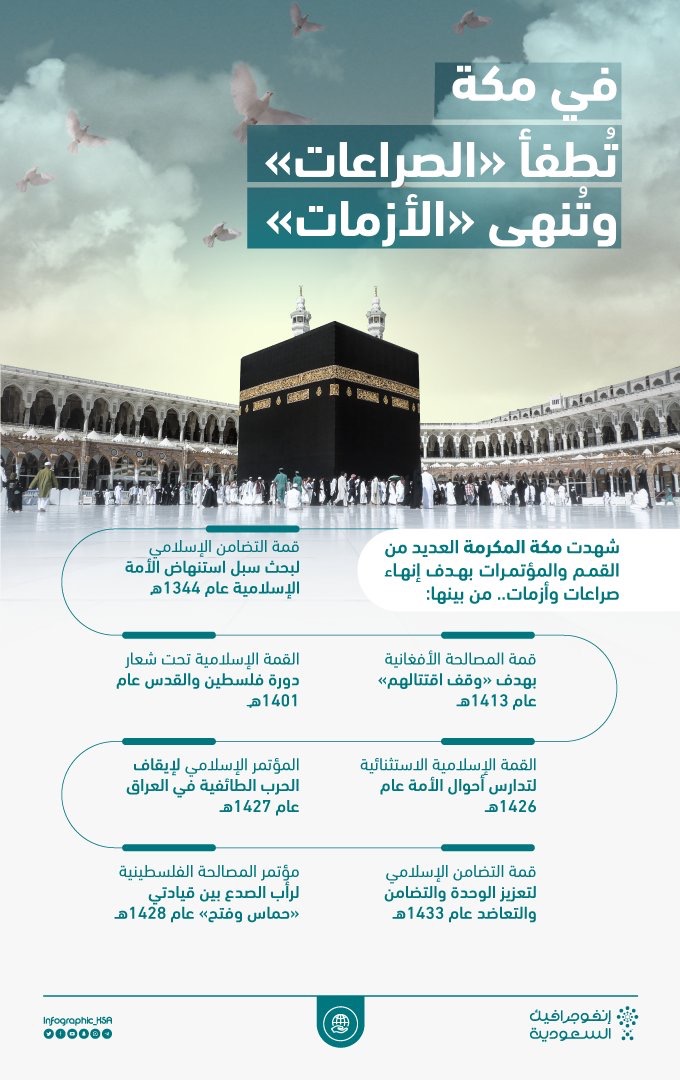 وفي مكة المكرمة تُطفأ الصراعات وتُنهى الأزمات، حيث شهدت المنطقة العديد من القمم والمؤتمرات التي تهدف إلى إنهاء أزمات وصراعات، ومن بينها قمة التضامن الإسلامي لبحث سبل استنهاض الأمة الإسلامية في عام 1344هـ.
