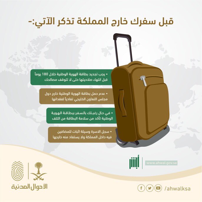وأكدت الأحوال، عبر إنفوجرافيك نشرته على حسابها بموقع “تويتر”، أنه يجب تجديد بطاقة الهوية الوطنية خلال 180 يومًا قبل انتهاء صلاحيتها؛ حتى لا تتوقف مصالح المسافر، كما يجب عدم حمل بطاقة الهوية الوطنية خارج دول مجلس التعاون الخليجي تفاديًا لفقدانها.