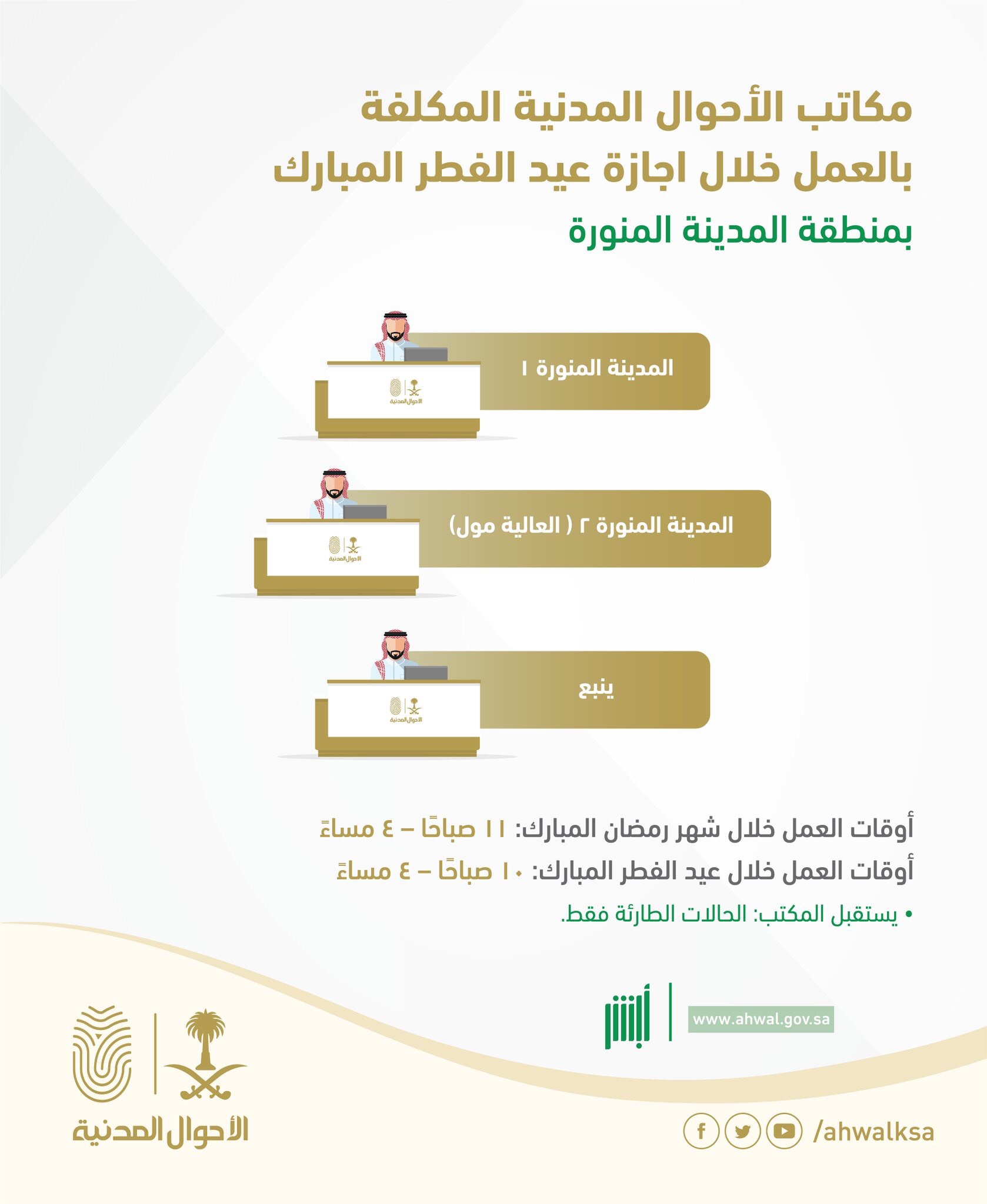 كلّفت وكالة وزارة الداخلية للأحوال المدنية عددًا من الإدارات والمكاتب في مختلف مناطق ومحافظات المملكة بالعمل خلال إجازة عيد الفطر المبارك؛ لإنجاز الأعمال الطارئة والضرورية التي لا يمكن تأجيلها كحالات الولادة والوفاة.
