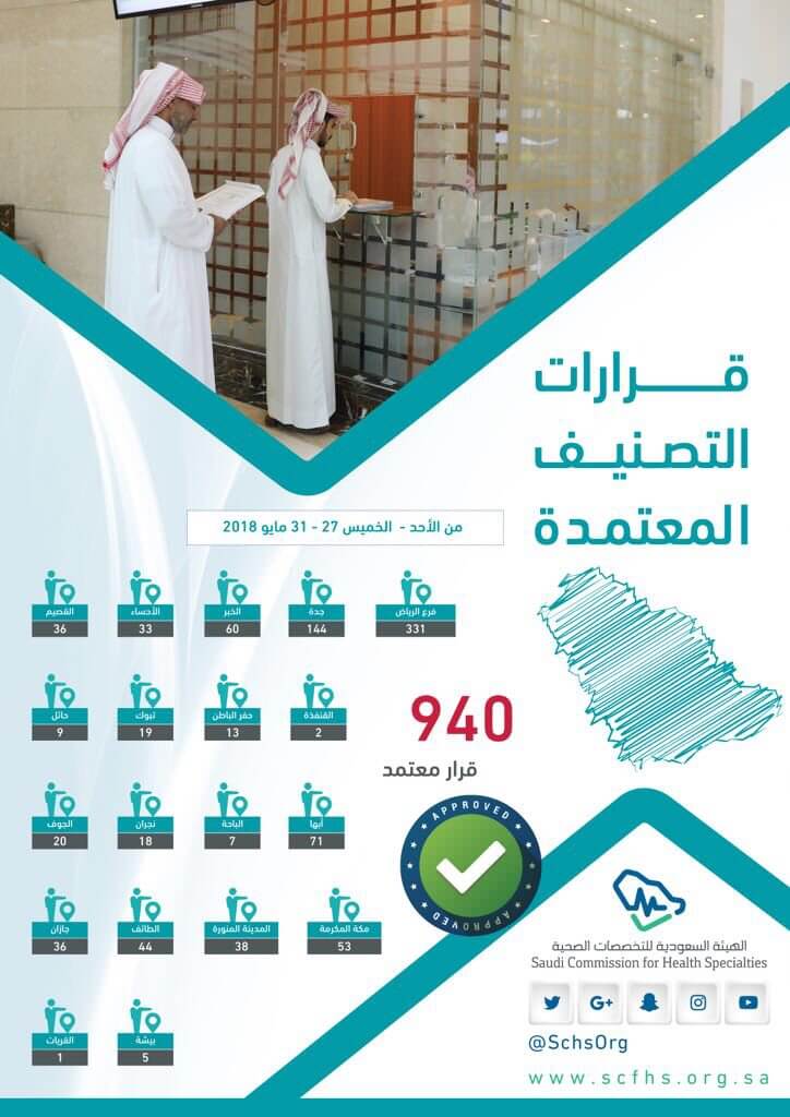 وأوضحت التخصصات الصحية في تغريدة عبر حسابها حسابها الرسمي بموقع التواصل الاجتماعي “تويتر”، أنها اعتمدت في الفترة المذكورة 940 قرارًا للتصنيف في عدد من مناطق المملكة.