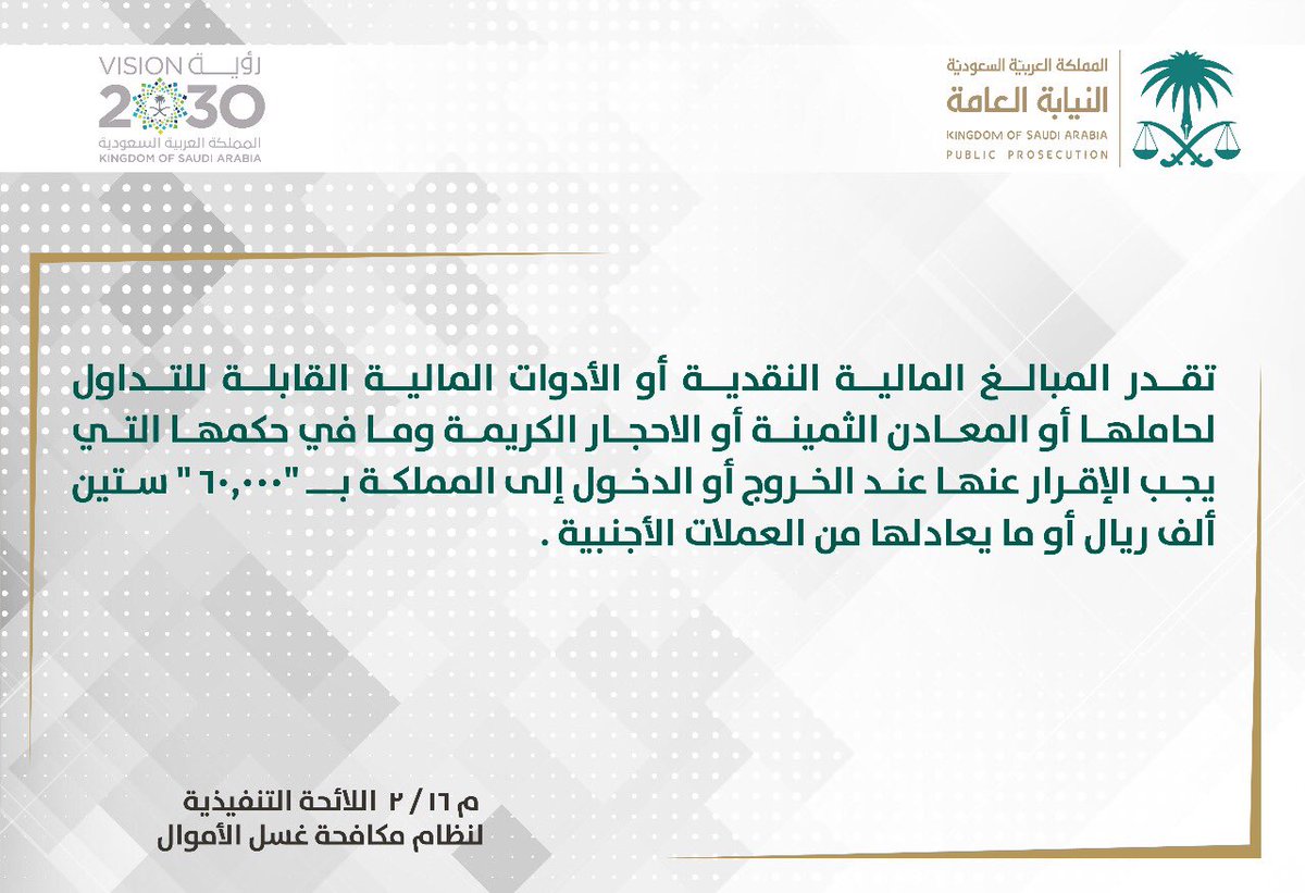 وأوضحت النيابة، في تغريدة لها عبر “تويتر”، أنه يجب الإقرار عن المبالغ المالية النقدية، والأدوات المالية القابلة للتداول لحاملها، وأيضًا المعادن الثمينة أو الأحجار الكريمة وما في حكمها، والتي تقدر قيمتها بـ(60000) ستين ألف ريال أو تزيد، أو ما يعادلها من العملات الأجنبية.