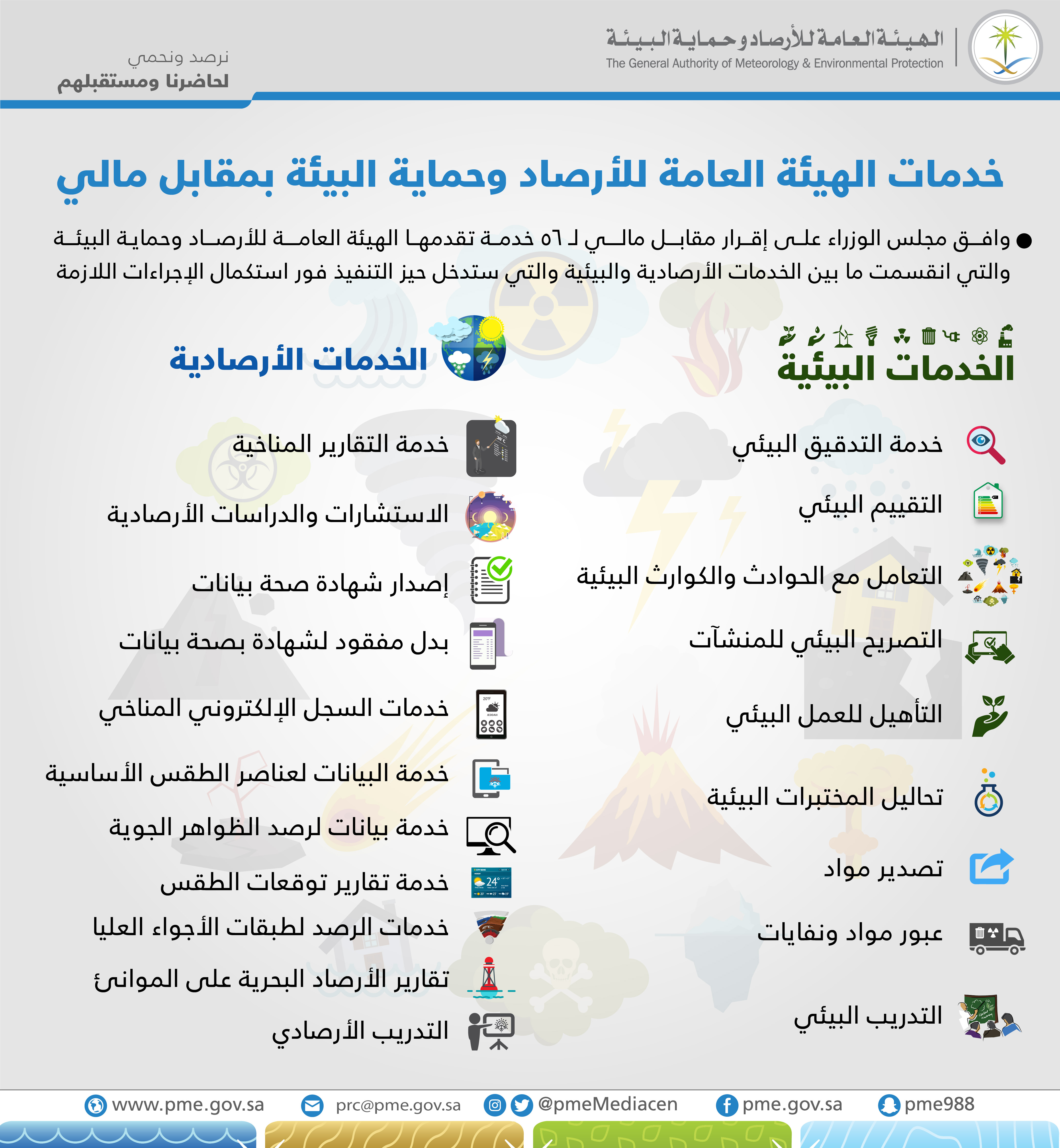 كشف نائب الرئيس العام لشؤون الخدمات المشتركة المهندس عبدالعزيز السفياني أن الهيئة بدأت في العمل المعني على تنفيذ قرار مجلس الوزراء الذي أقر مؤخراً تقديم 56 خدمة في الهيئة العامة للأرصاد وحماية البيئة بمقابل مالي والتي انقسمت ما بين الخدمات الأرصادية والبيئية.