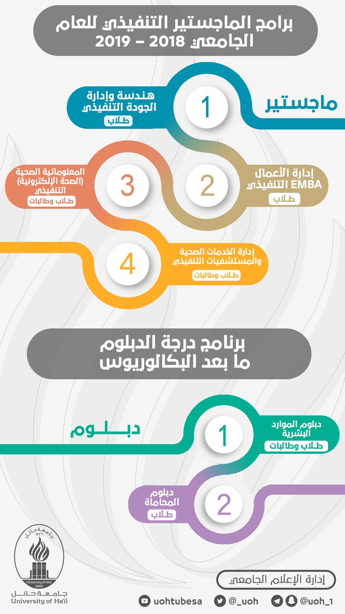 كما أعلنت جامعة حائل كذلك عن برنامجين في درجة الدبلوم ما بعد البكالوريوس، وهي ”دبلوم الموارد البشرية “للطلاب – والطالبات”، ودبلوم المحاماة ”للطلاب”.
